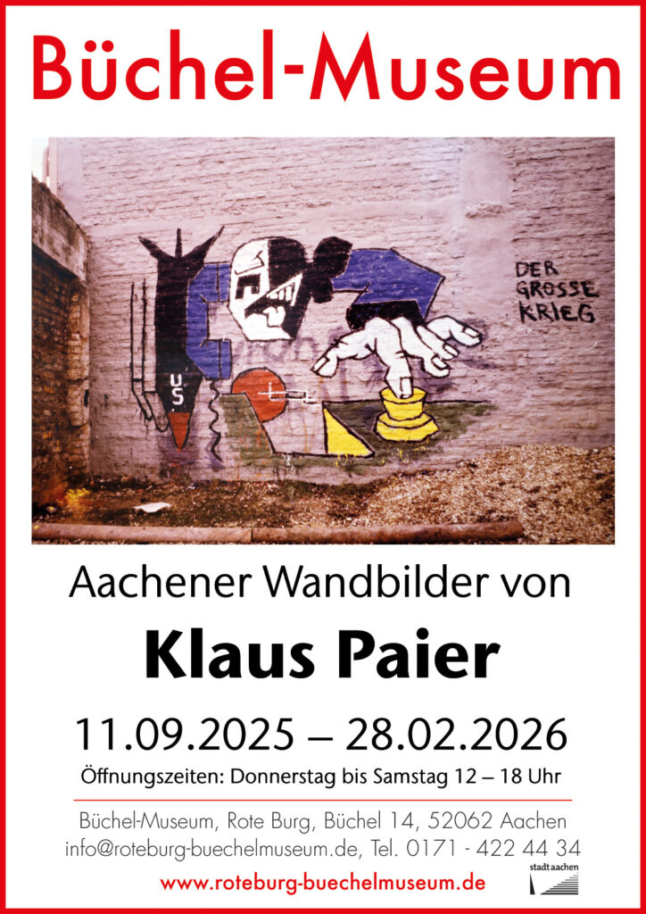 eine Ausstellung mit Wandmalereien von Klaus Paier, wobei die überwiegend in Aachen gemalten Wandbilder als Fotografien präsentiert werden.